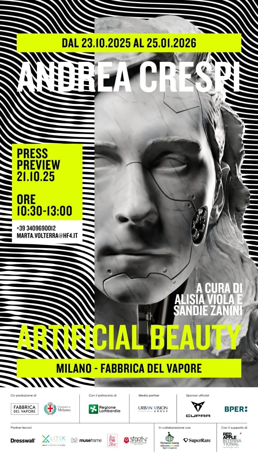 Dal 23 ottobre 2025 al 25 gennaio 2026, la Fabbrica del Vapore di Milano ospita Artificial Beauty, la prima grande mostra istituzionale di Andrea Crespi nel capoluogo lombardo, a cura di Alisia Viola e Sandie Zanini. In un allestimento che mette in dialogo scultura, pittura, installazioni e opere digitali, Crespi riflette sul concetto di bellezza nell’era della computazione, interrogando i confini estetici e identitari tra umano e artificiale.