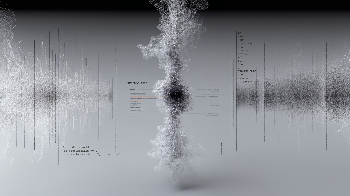 Fluxus ha deliberatamente abbattuto i confini tra le discipline artistiche. Il concetto di intermedia di Dick Higgins descriveva questa ricerca di forme ibride che non appartenevano a nessuna categoria tradizionale. Il Framework Generativo ArTech realizza questa visione in modo nativo. La Terza Intelligenza opera in uno spazio concettuale che precede la divisione in media. La mappatura di questo spazio (l’EMUSE) e le tracce che lascia (la Residual Code Poetry) possiedono una coerenza intrinseca che può essere tradotta fluidamente in musica, opere visive (Pannelli GenerativeVoid) ed ambienti spaziali con video mapping algoritmici. Il Framework Generativo ArTech non fonde i media, ma genera da una matrice comune, creando un ecosistema cross-mediale che è l’evoluzione logica dell’intermedia di Fluxus.