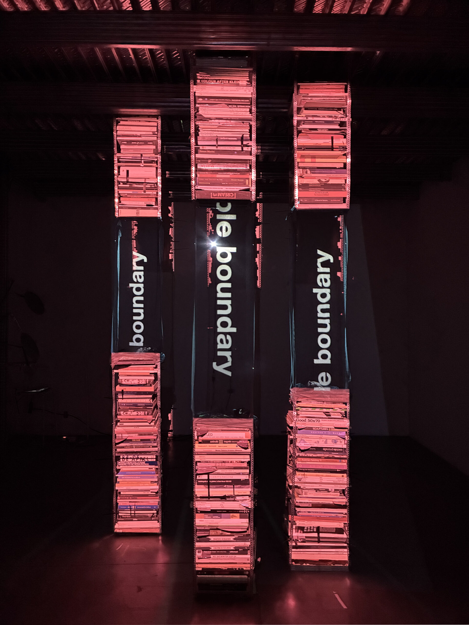 L’intervento di Landucci si sviluppa come un’installazione site-specific dove l’Archivio – inteso non solo come contenitore di libri e materiali, ma come custode di un canone e di un ordine della conoscenza – viene messo in dialogo con un sistema di generazione testuale in tempo reale basato su AI. I libri dell’archivio diventano supporti su cui si proiettano frasi generate da un’intelligenza artificiale addestrata, che agisce come agente estraneo, decodificante e ricodificante, capace di alterare e disturbare le narrazioni consolidate.