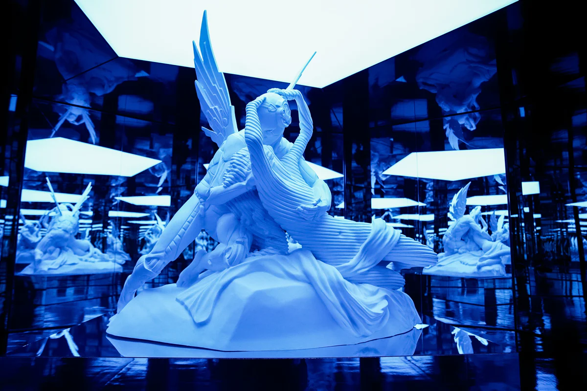 Dal braccio robotico agli ambienti immersivi in cui l’Amore e Psiche di Canova si declina in chiave futuristica – umanoide, moltiplicandosi in un gioco infinito di specchi; passando attraverso dipinti a olio che incontrano ipotetici furti d’identità hacker; sculture di nuove Veneri e avveniristiche Nike di Samotracia fino alle video installazioni.