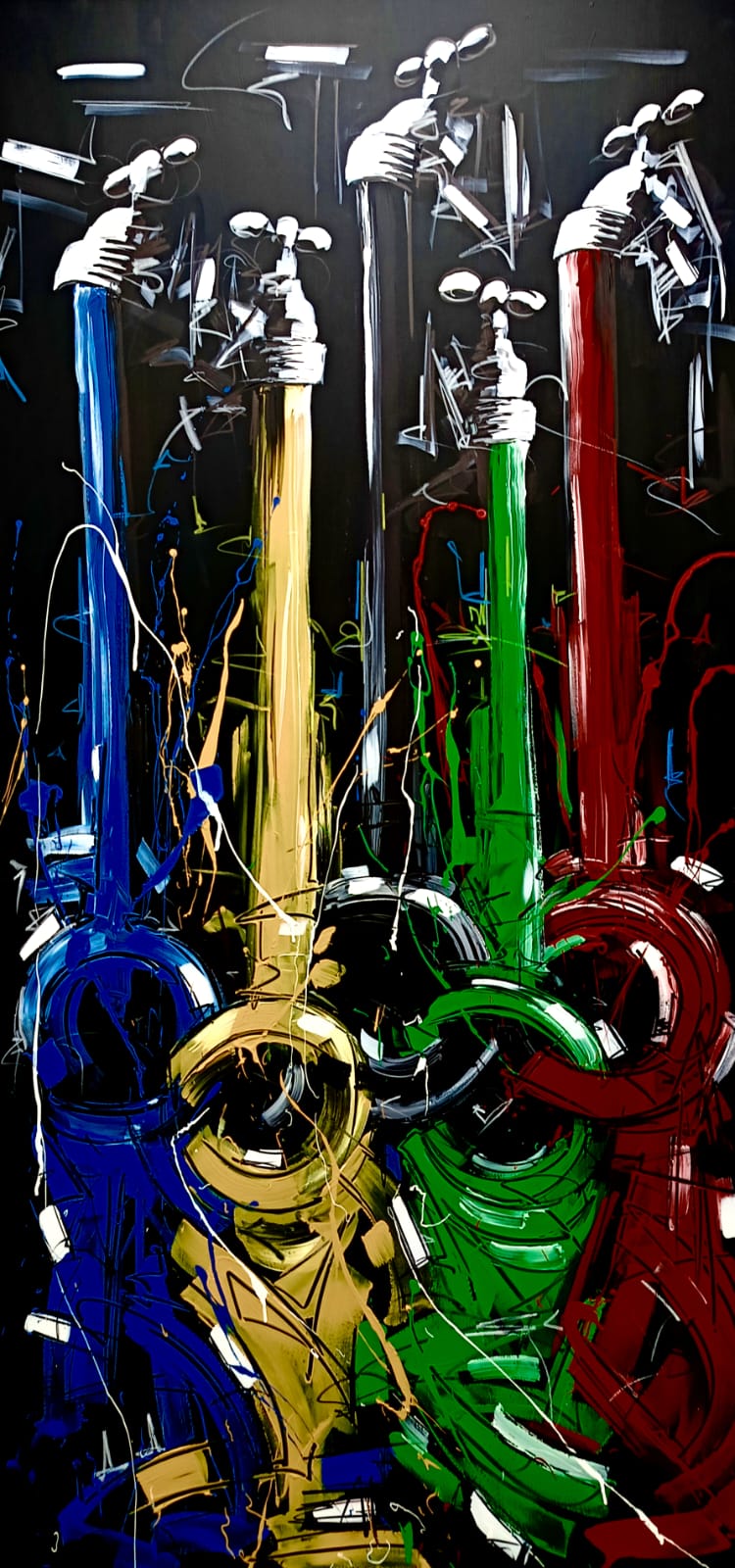 Nel murale, Tamburro raffigura cinque rubinetti — elemento iconografico ricorrente nel suo lavoro — da cui scorre acqua colorata che, trasformandosi in cerchi intersecati, genera il simbolo olimpico. Nella parte inferiore, i colori si espandono su uno sfondo nero in un’esplosione visiva di energia. È un’immagine di potenza vitale, costruita con un segno deciso e una velocità esecutiva che è cifra essenziale della poetica dell’artista: una celebrazione del movimento, della forza, della vita stessa.