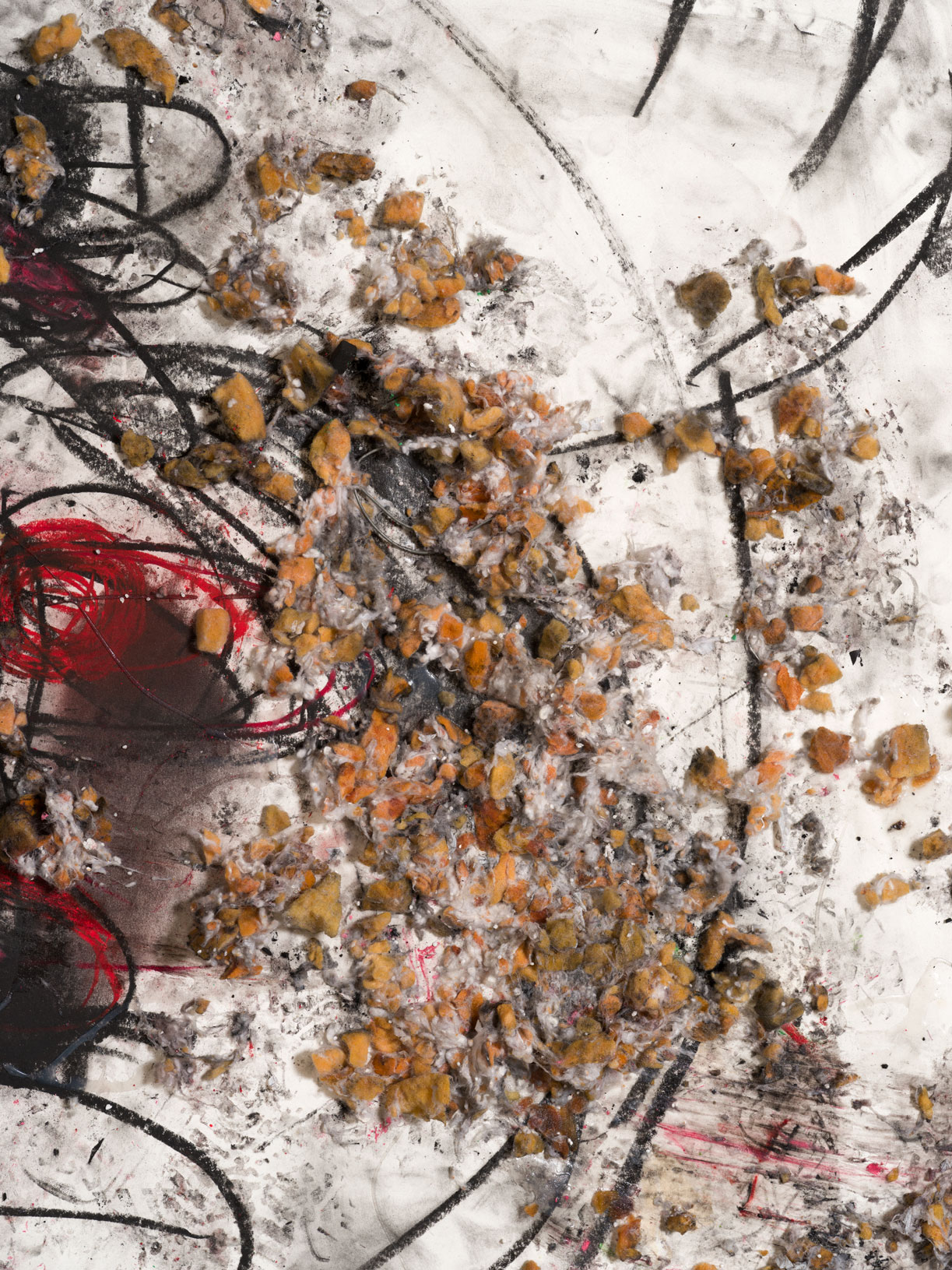 I disegni esposti nascono direttamente durante queste sessioni performative. Realizzati mentre gli artisti agiscono nei rispettivi ruoli, i lavori su carta registrano segni rapidi, espressionisti, spesso violenti. Il gesto grafico diventa una traccia immediata dell’azione: improvvisazione, dialogo e conflitto sono parte integrante del processo. Più che opere finite, questi lavori mostrano il processo stesso della performance, trasformando il disegno in una forma di documento corporeo.